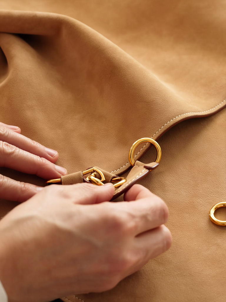 Every detail is chosen with care, from the brushed metal to the soft suede that rests gently against the coat.